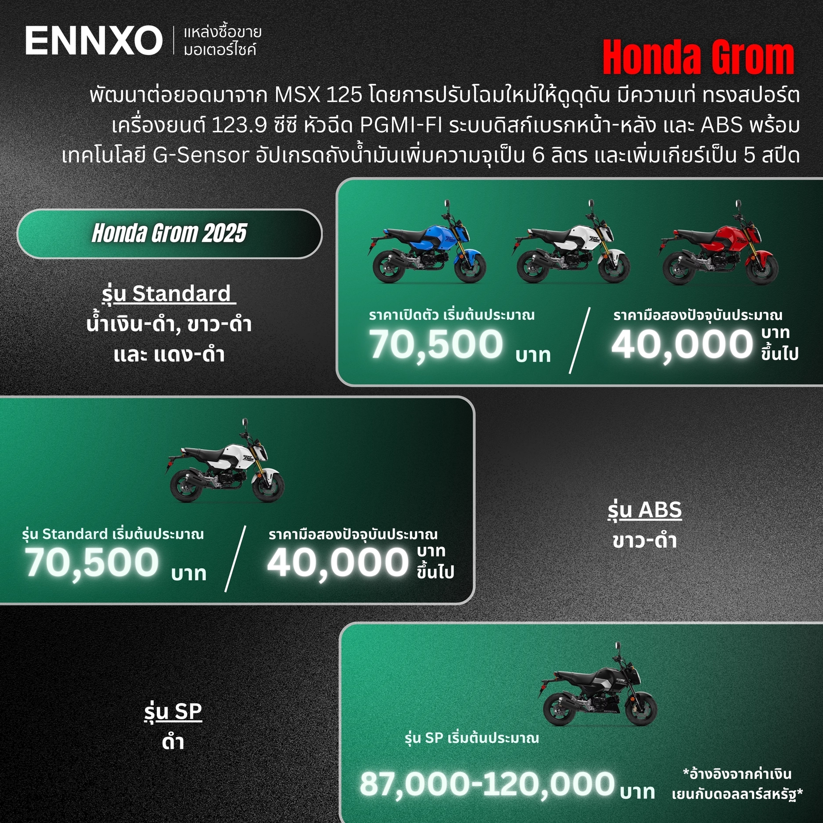 * สำหรับ Honda Grom เป็นมอเตอร์ไซค์รุ่นที่พัฒนาต่อยอดมาจาก MSX 125 SF ซึ่งยังคงได้รับความนิยมทั้งมือหนึ่ง และมือสอง โดยเรทราคามือสองขึ้นอยู่กับสภาพรถ จำนวนไมล์ และรุ่นปีด้วย