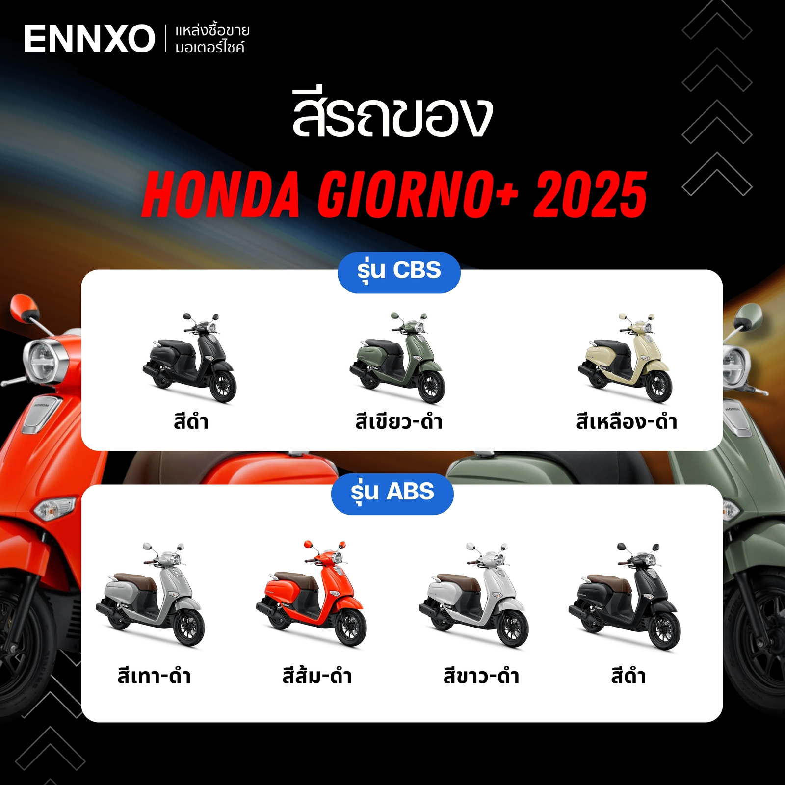 สีรถของจีออโน่ปี 2025 ขนสีสันใหม่มาแบบจัดเต็ม มีด้วยกันทั้งหมด 6 สี 7 สไตล์ให้เลือก คือ Honda Giorno+ รุ่น CBS มี 3 สี ได้แก่ สีเขียว-ดำ, สีเหลือง-ดำ และสีดำ ส่วน Honda Giorno+ รุ่น ABS มี 4 สี ได้แก่ สีส้ม-ดำ, สีขาว-ดำ, สีเทา-ดำ และสีดำ