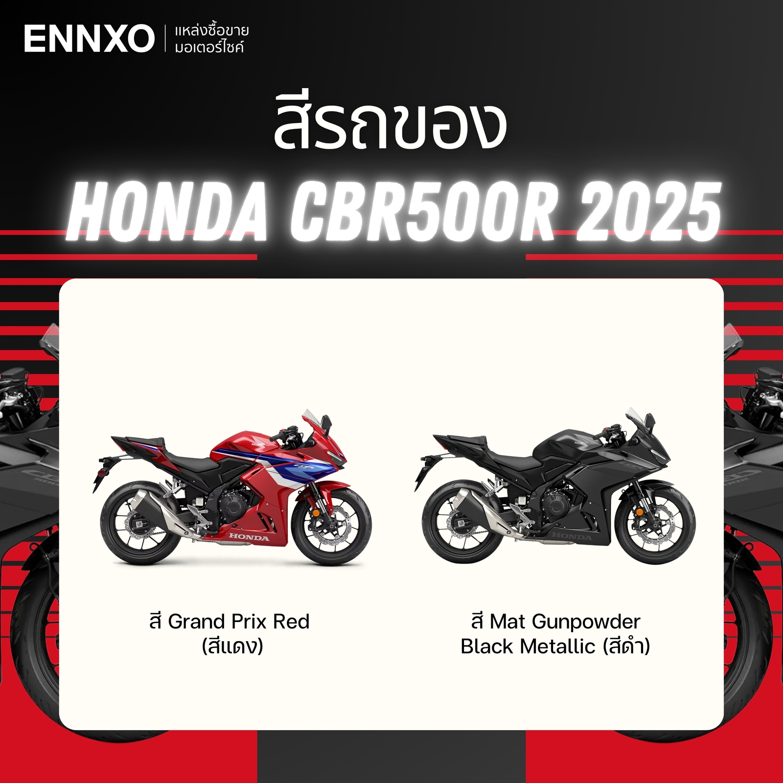 สำหรับสีรถ Honda CBR500R มีทั้งหมด 2 สี คือ สี Grand Prix Red (สีแดง) และสี Mat Gunpowder Black Metallic (สีดำ)