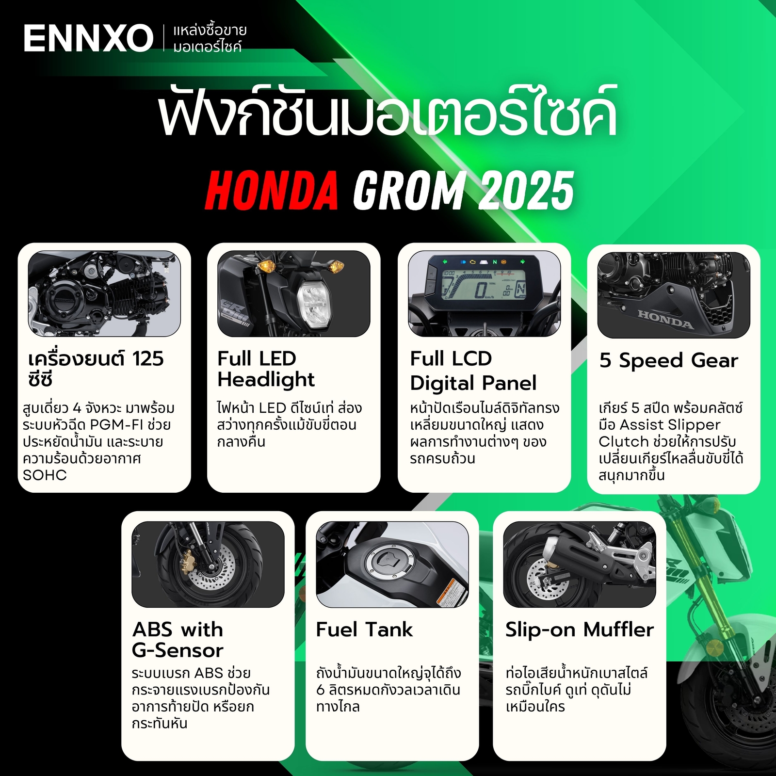 ถึงแม้ว่า Honda Grom 2025 อาจจะไม่ได้มีอะไรที่ดูแตกต่างไปจากรุ่นก่อนหน้า แต่มินิไบค์ไซส์เล็กอย่างฮอนด้า Grom 2025 ก็มาพร้อมสีสัน ดีไซน์ตัวรถ และลวดลายกราฟิกใหม่ที่น่าสนใจ น่าหาซื้อมาขับสักคัน สำหรับคนที่ตามหามอเตอร์ไซค์ทรงสปอร์ต ขนาดกะทัดรัด ขี่สนุก คล่องตัว และปรับแต่งได้หลากหลาย ฮอนด้า Grom 2025 เป็นคำตอบที่ใช่เลย รีบไปจับจอง หาซื้อกันได้เลย! แต่หากยังไม่รู้จะไปซื้อขาย Honda MSX Grom ที่ไหน มาใช้บริการกับ ENNXO ตลาดมอเตอร์ไซค์ออนไลน์ มีให้เลือกหลากหลายยี่ห้อ รุ่น สี และราคา ไม่ว่าจะเป็น Honda Grom 2025 ฮอนด้า Grom รุ่นเก่า Honda Grom มือสอง หรือมินิไบค์มือสองคุณภาพดี จะเลือกซื้อก็สะดวก จะลงขายก็ทำได้ง่ายๆ แถมฟรี ครบจบเรื่องมอเตอร์ไซค์ในที่เดียว
