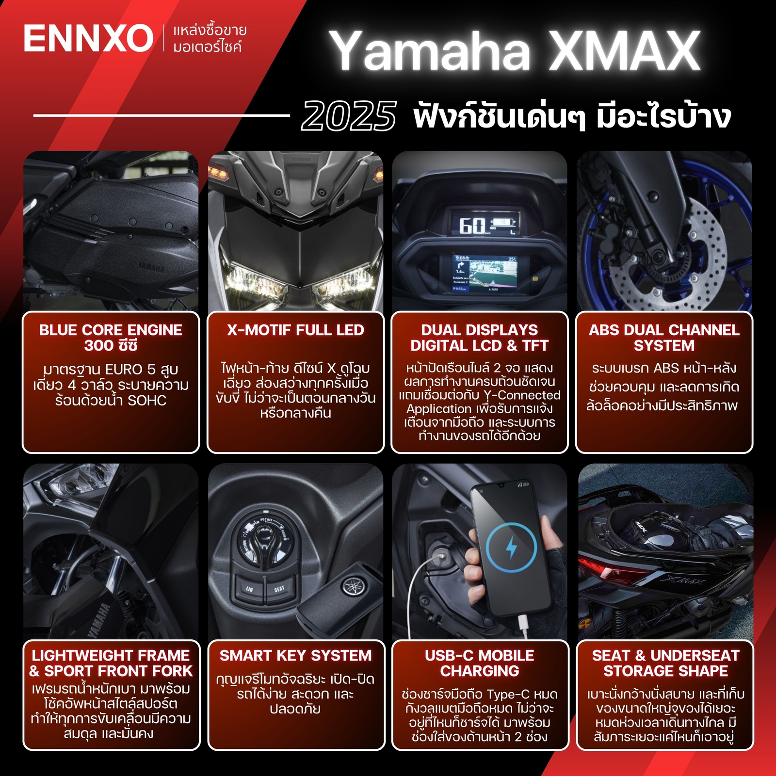 จบไปแล้วกับข้อมูลสเปค และฟังก์ชันของมอเตอร์ไซค์ Yamaha XMAX 2025 โดยรวมเป็นรถที่น่าสนใจเลยทีเดียว ด้วยรูปลักษณ์ทันสมัย มีให้เลือกหลายเฉดสี มาพร้อมเครื่องยนต์คุณภาพ แถมฟังก์ชัน และฟีเจอร์ใช้งานที่ครอบคลุม ตอบโจทย์ ใครที่ต้องการหาซื้อยามาฮ่า XMAX 2025 ราคาพิเศษ สภาพดี หรืออยากลงขายมอเตอร์ไซค์ XMAX คันเก่าเพื่อเปลี่ยนเป็นคันใหม่ที่ถูกใจกว่าก็ทำได้ ลงขายฟรี ไม่มีค่าธรรมเนียมต้องที่ ENNXO ตลาดมอเตอร์ไซค์ออนไลน์ มีตัวเลือกมากมาย หลายรุ่น สี และเรทราคา ครบจบทุกเรื่องมอเตอร์ไซค์ไว้ใจเอ็นโซ่
